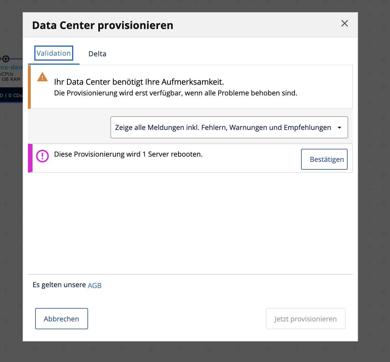 - Anschließend müssen bestätigen dass der Server durch die Provisionierung neu bootet. Im nachfolgenden Passwort Fenster geben Sie Ihr persönliches Kennwort Ihres IONOS DCD Accounts ein. Klicken Sie anschließend auf jetzt provisionieren.