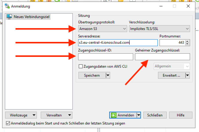 Wir empfehlen für den Zugriff auf den S3 Storage die kostenfreie Software WinSCP.