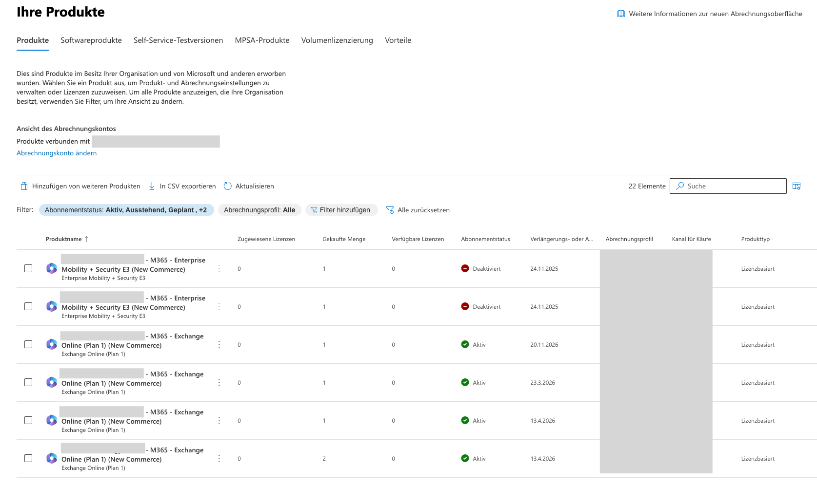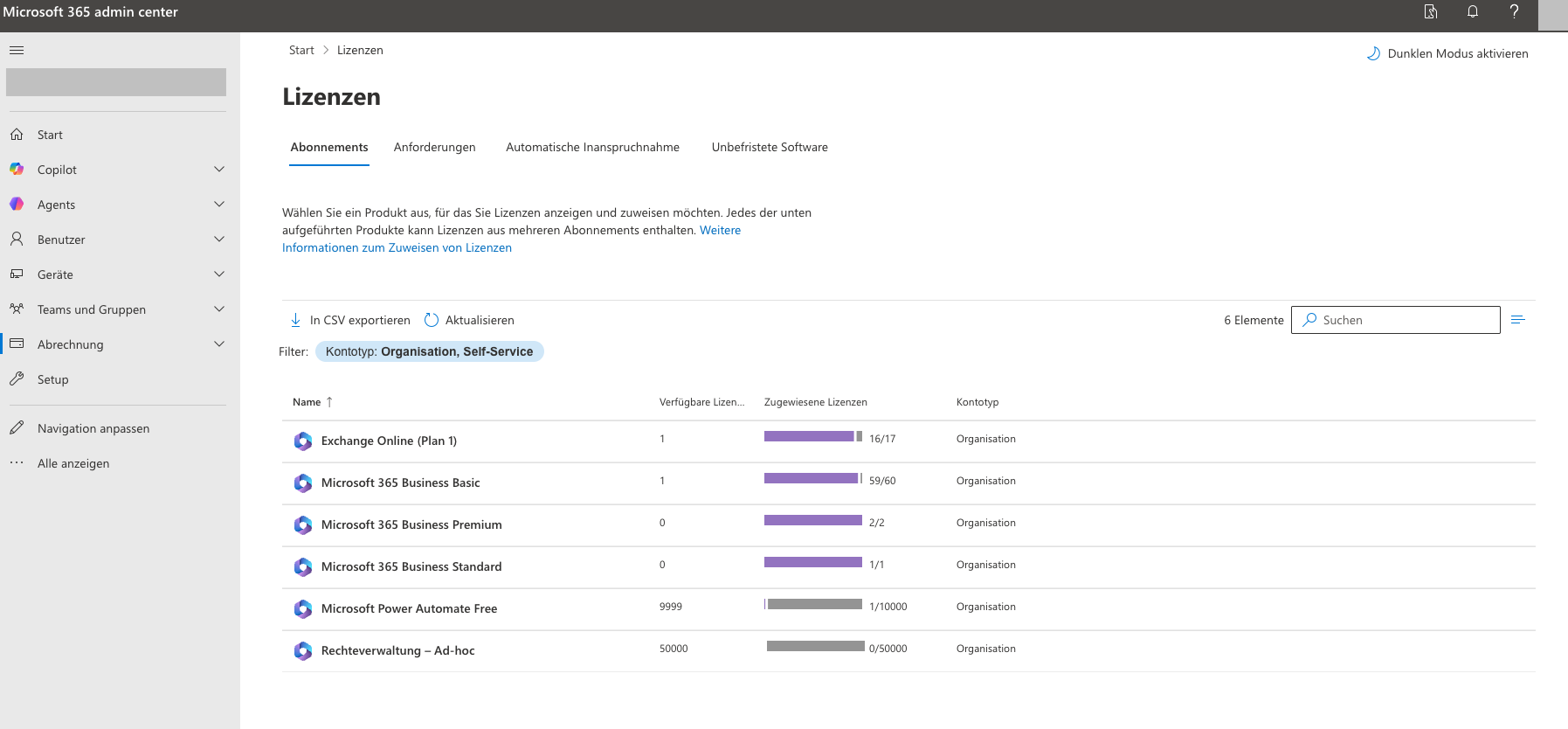 Sie können auch eine Auflistung der Microsoft 365 Lizenzen einsehen. Die Aufstellung erhalten Sie über folgenden Link: https://admin.cloud.microsoft/#/subscriptions