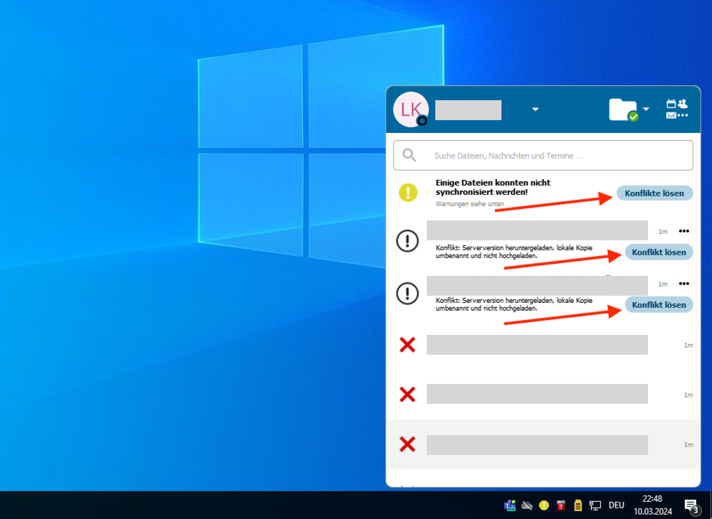 Mit einem Klick auf das "gelbe Symbol" kann der NextCloud Client geöffnet werden, wo erklärt wird, welches Problem es mit welcher Datei gibt.