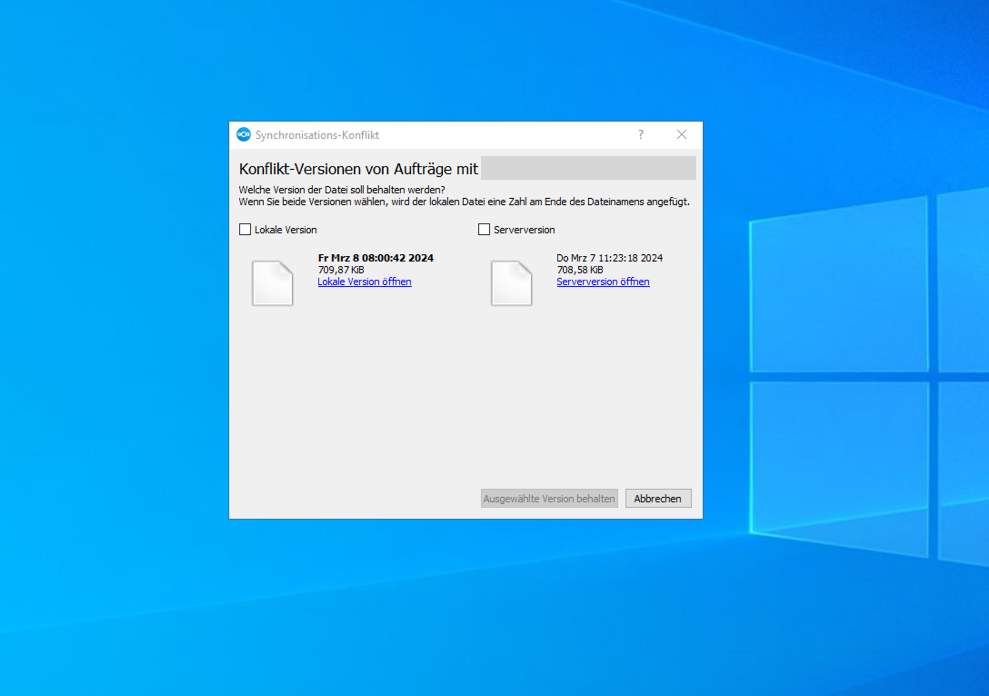 Sie müssen nun selbst entscheiden, welche Version behalten werden soll. Die Serverversion ist in dem Fall die aktuelle Version der NextCloud. Die lokale Version ist Ihre Version die Sie erstellt haben. Ggfs. würde ich auch das Datum vergleichen. Mit einem Klick auf Server Version öffnen oder Lokale Version öffnen, kann man nochmal ins Dokument schauen.