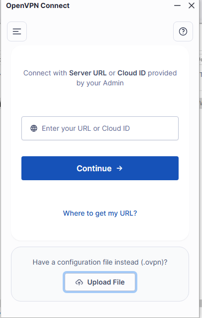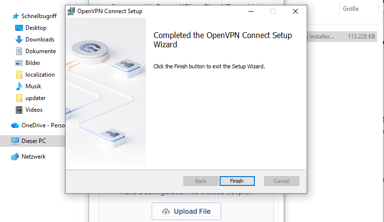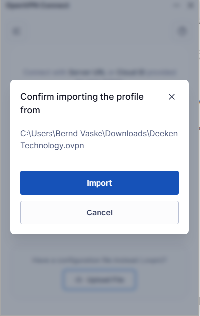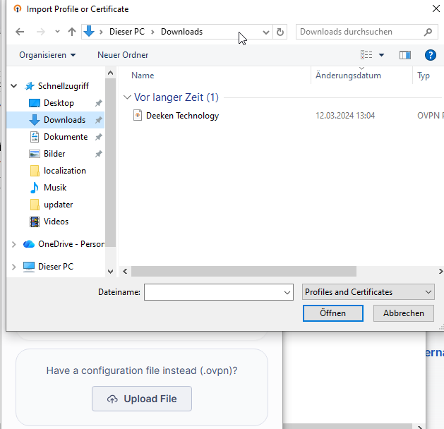Im OpenVPN Connect Client Fenster klicken wir nun auf "Upload File" und wählen die Konfigurationsdatei aus (in diesem Beispiel Deeken.Technology)