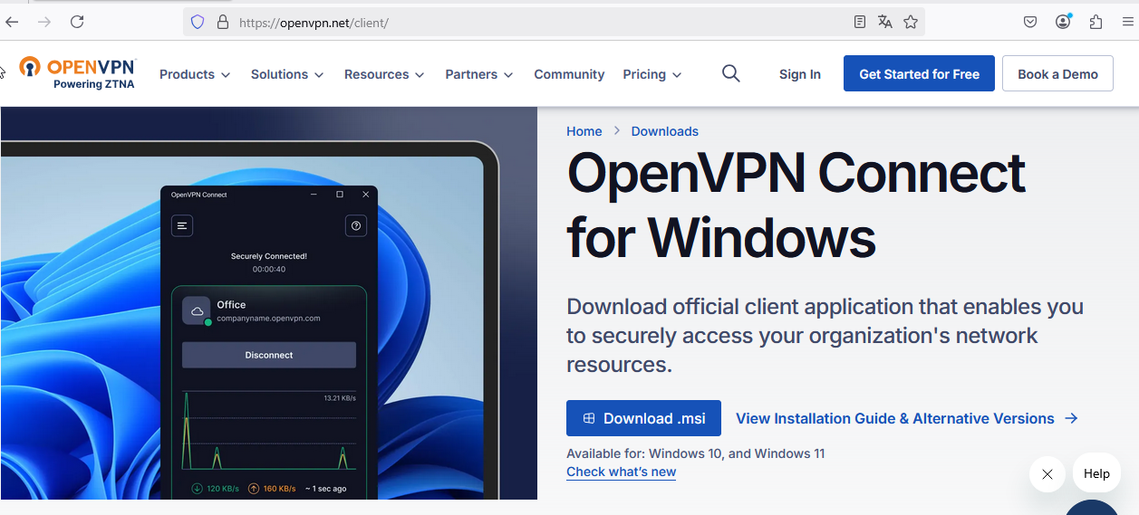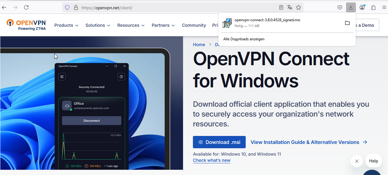 Wir laden uns den Windows Client unter https://openvpn.net/client/ herunter. Hierzu klicken wir auf Download.msi.